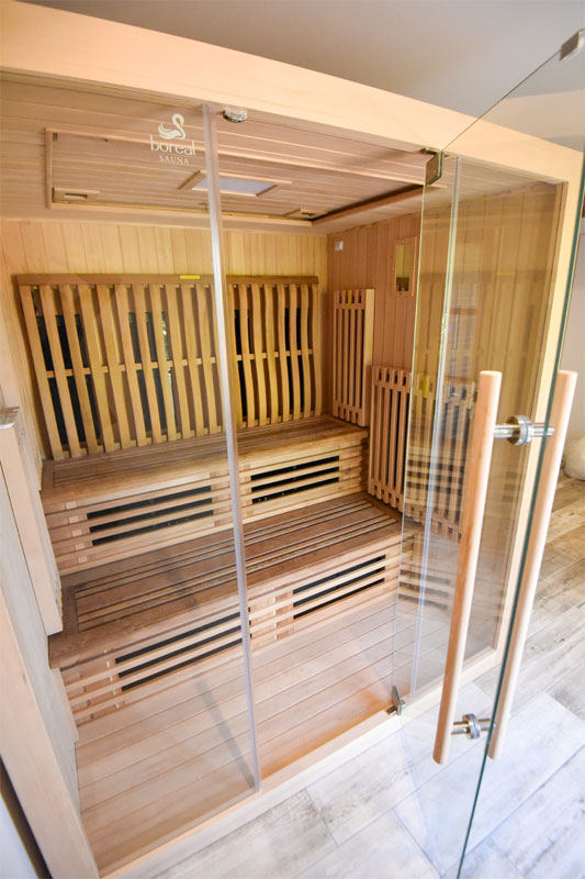 - 1 terrasse au nord donnant sur le jardin avec salon de jardin, de laquelle on accède à l'espace sauna comprenant douche et sanitaire.