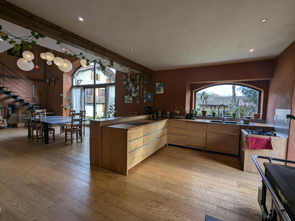 - Au rdc, un espace de vie de plus de 80 m² avec une grande cuisine ouverte, un coin salon avec un poêle de masse, une banquette chauffante et une grande table qui donne face à une grande baie vitrée