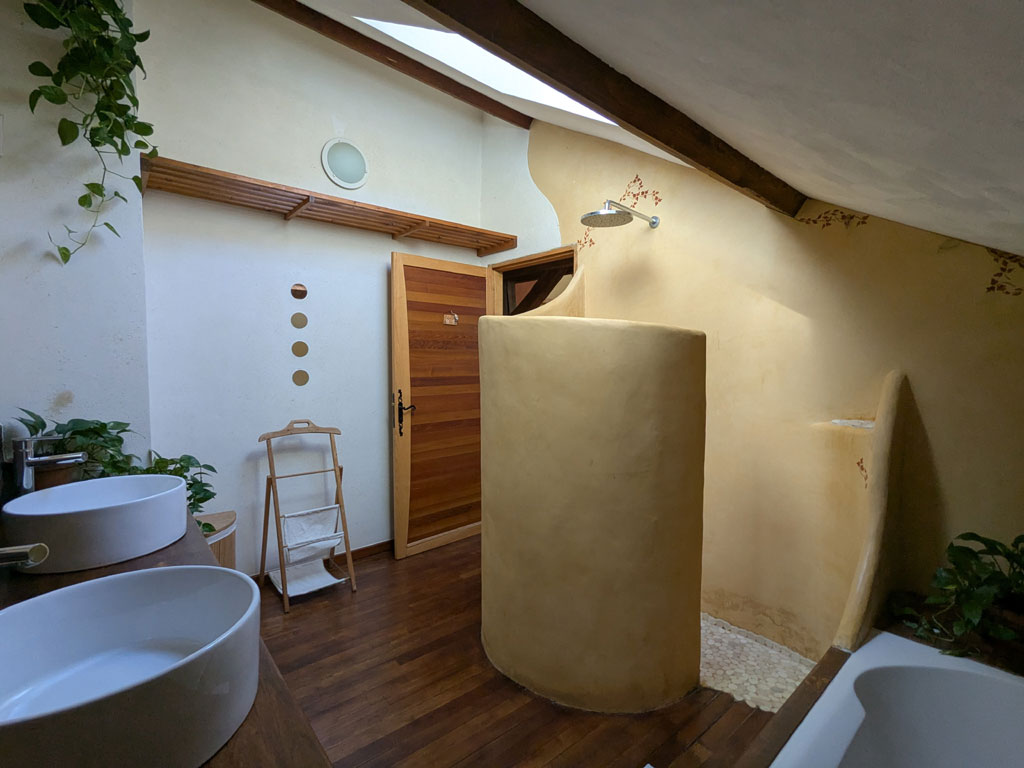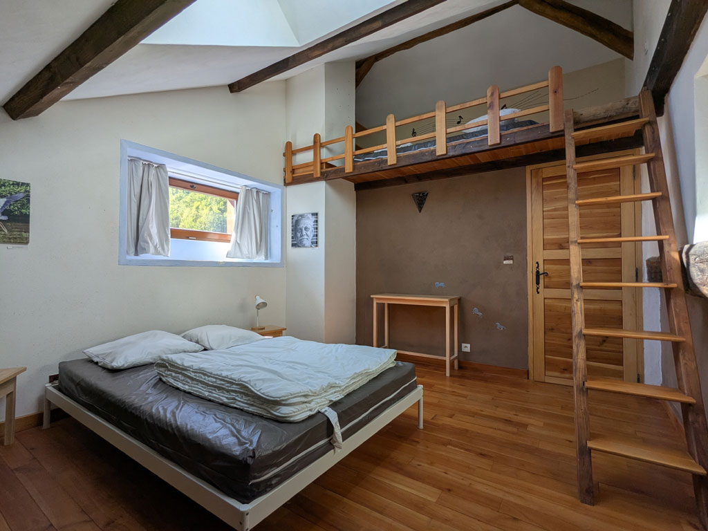 L’espace a été pensé pour un confort optimal : chauffage par poêle bouilleur et panneaux solaires, murs chauffants, toilettes Separett et installation électrique à faible champ électromagnétique.