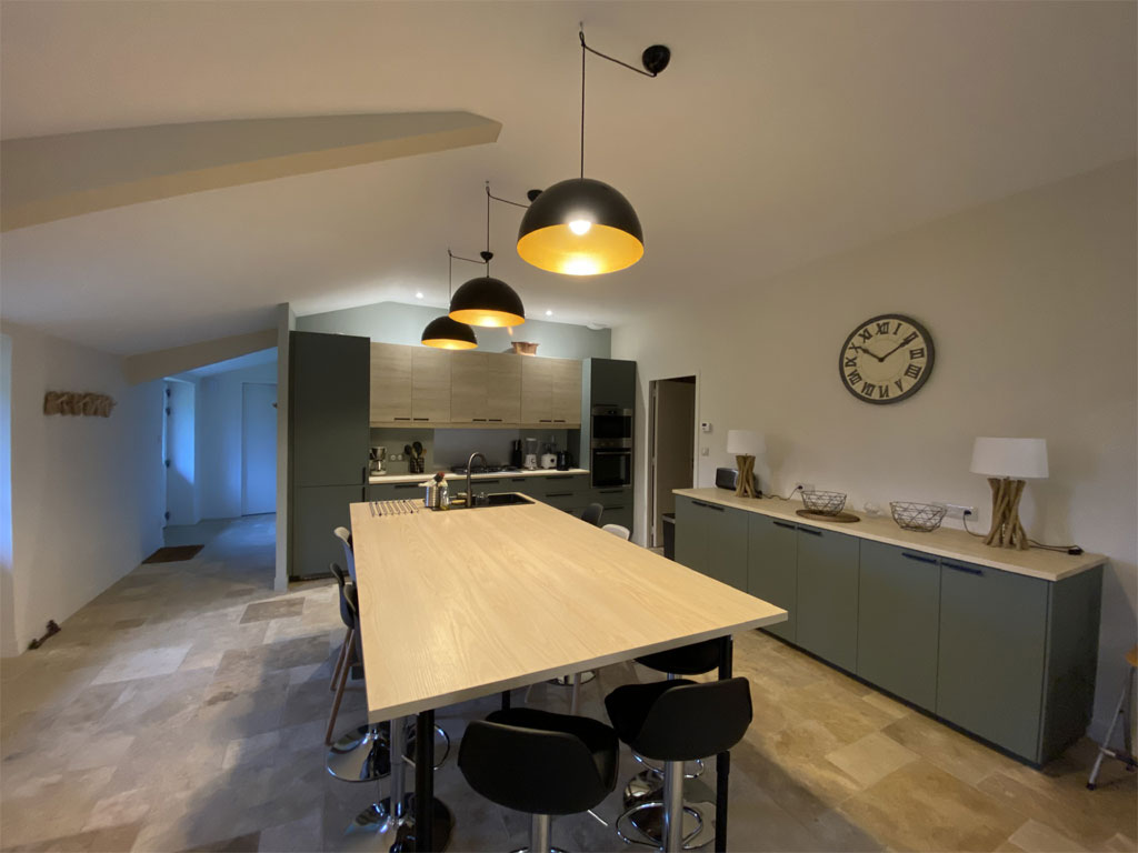 - Une verrière sépare la cuisine, composée d'un ilot central et pouvant réunir 8 personnes simultanément
