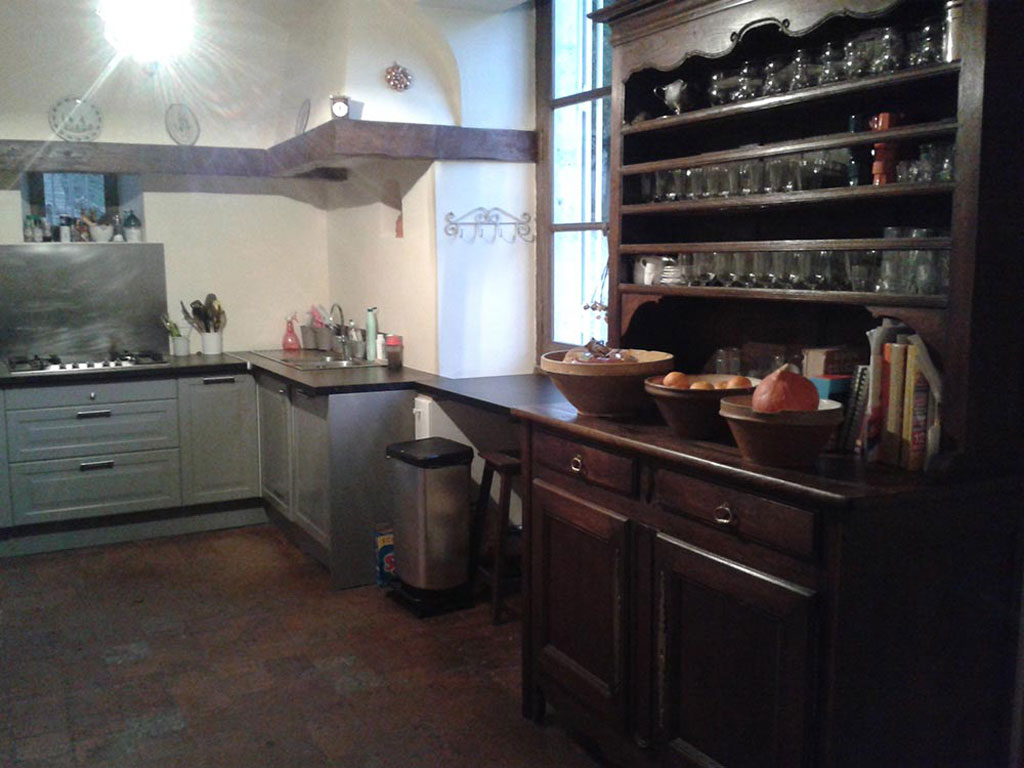 Au rez-de-chaussée, une grande cuisine avec table pour 25 personnes, suivie d’une salle à manger, d’un grand salon et d’un petit salon, offrant différents espaces de convivialité et de détente