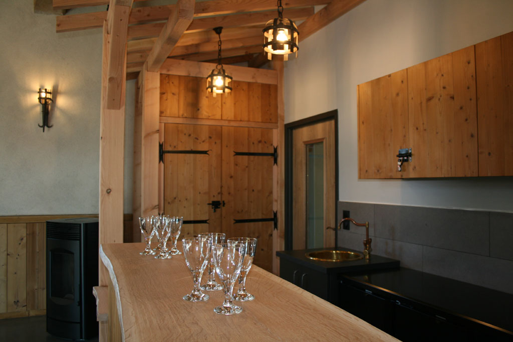 La salle de réception, au même niveau que le grand gite, est équipée d'un bar et frigo de 500 l, fait 80 m² pour 50 personnes assises.