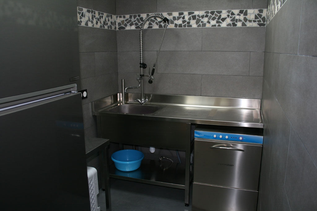 Cuisine équipée et office avec matériel professionnel (plonge, lave-vaisselle, cuisinière et four électrique) pour faire la cuisine ou recevoir un traiteur.