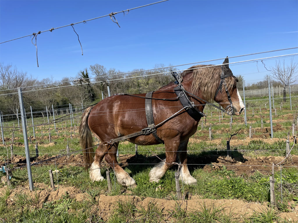 Vous ferez aussi la connaissance d’Églantine, notre cheval de trait qui nous aide à l'entretien des vignes.