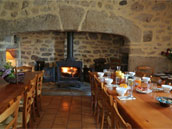 Au rez-de-chaussée, une grande cuisine est équipée avec du matériel professionnel et les ustensiles de cuisine sont adaptés à la capacité d’accueil pour permettre la préparation de repas. Une salle à manger avec cheminée est au même niveau ainsi qu’une terrasse pour déjeuner à l’extérieur.