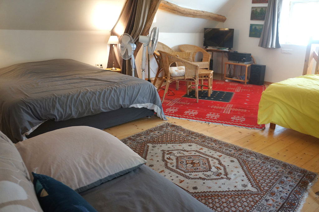 Gîte des écuries 7 pers. max : En plus du séjour-cuisine et des douches-toilettes, il comprend 2 chambres : 1 double lit dans une chambre 2 personnes en rez-de-jardin, et une grande chambre pour 5 personnes à l’étage, avec deux double-lits et un simple lit (espaces séparés par des rideaux occultants).