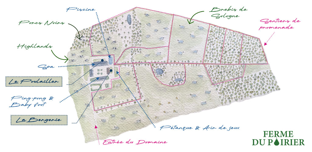 Le Domaine du Poirier, c’est aussi une expérience au cœur de notre ferme de 110 ha, un moment hors du temps dans un sublime écrin de verdure, un lieu où se ressourcer, déconnecter, prendre soin de vous. Profitez de notre magnifique domaine, entourés de nos animaux (300 brebis, Porcs noirs, Highlands), jardin privatif, espace bien-être & sauna, piscine, pétanque, baby-foot, ping-pong, bar.