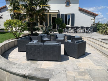 Terrasse - 2 grandes tables et 15 chaises - 2 canapés et 4 fauteuils en résine - 1 meuble avec 1 plancha à gaz - Transats (x5)