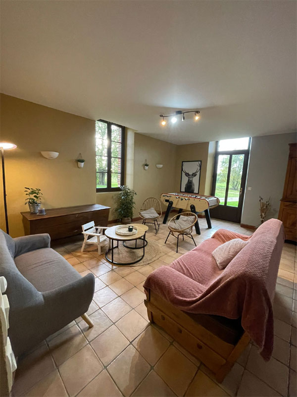 Vous y retrouverez une grande cuisine aménagée et un grand salon-salle à manger où vous pourrez vous divertir avec le baby-foot. Une balançoire, un terrain de pétanque, une table de ping-pong amuseront petits et grands.