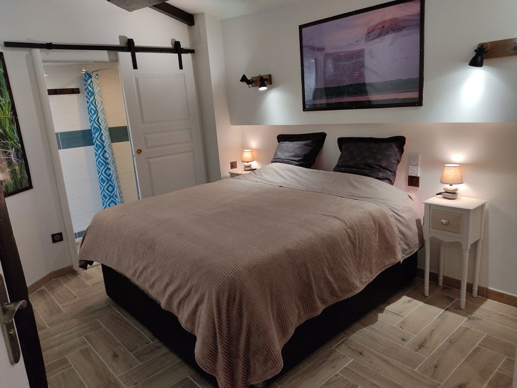 Accès direct sans marches depuis le parking du gite + portes Largeur 93cm + douche permettant l'accès en fauteuil roulant + salle de bain permettant le demi tour en fauteuil roulant (diam 1.50m) + fauteuil PMR de douche + lavabos PMR avec syphon déporté