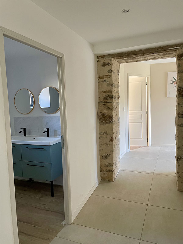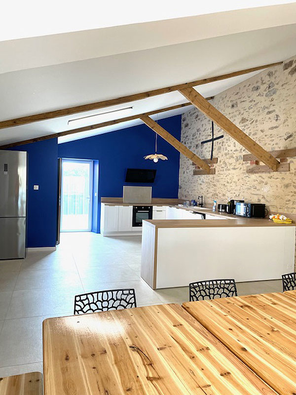 - 1 salle lumineuse de 110m², regroupant le salon, la salle à manger et une cuisine entièrement équipée