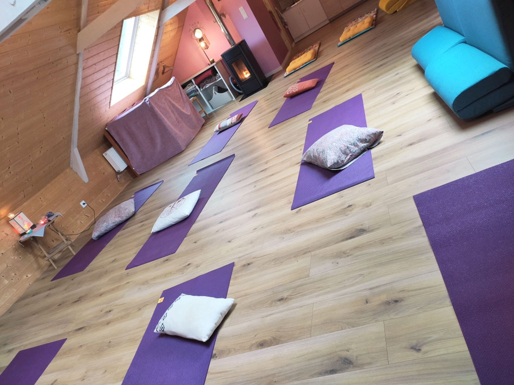 Modulable, la salle peut recevoir de 8 à 12 personnes pour des stages de yoga, qi gong, méditation, ateliers de développement personnel, formations ou pratiques artistiques (voix, théâtre, clown, art-thérapie). Selon vos besoins, elle peut être aménagée en espace ouvert avec tapis et coussins, en cercle avec fauteuils et chaises, ou autour d’une grande table de travail.