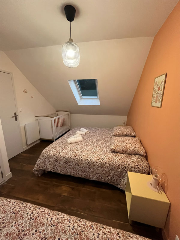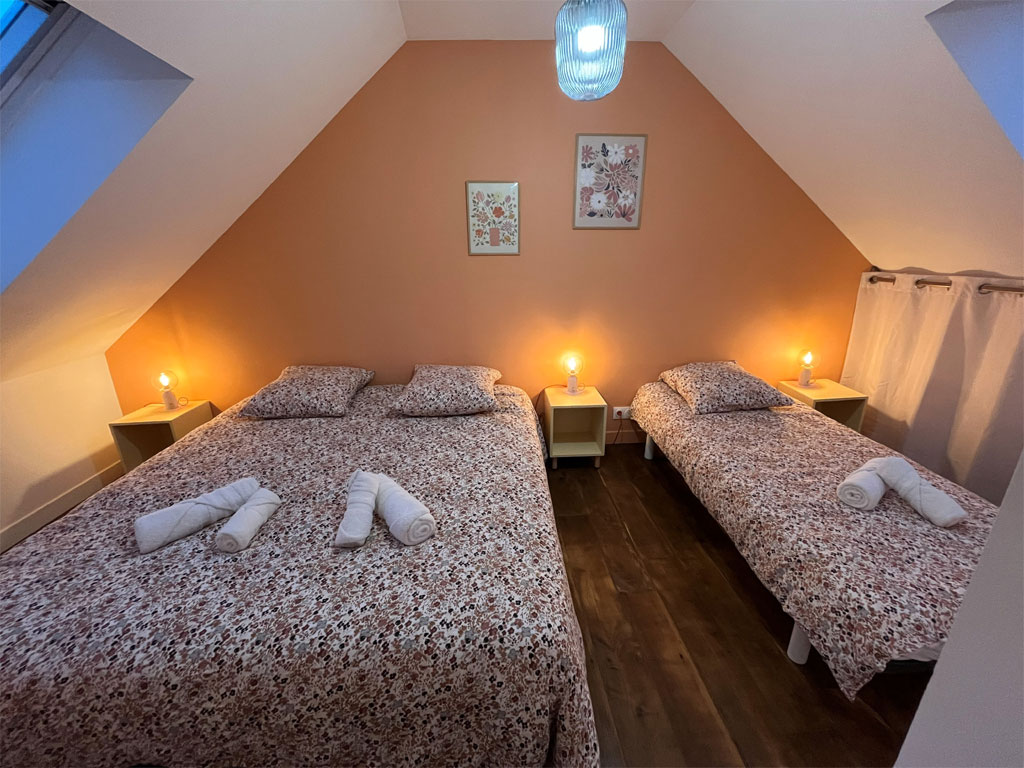 1 chambre composée de 3 lits simples et un lit bébé ainsi qu'une salle de bain privative (douche et vasque)