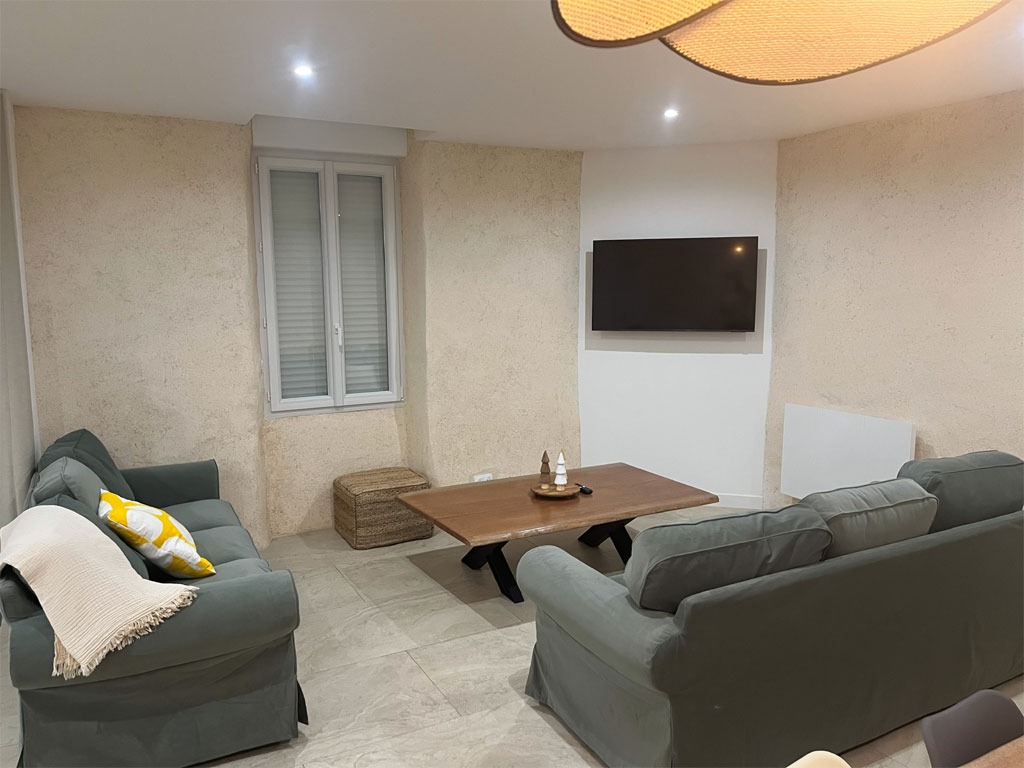 1 salon cosy avec 2 grands canapés et une smart TV