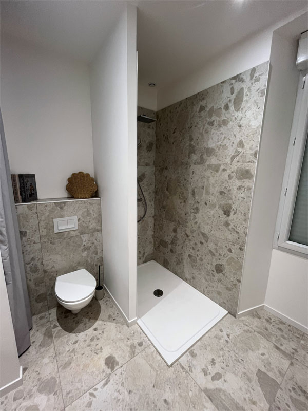 1 salle de bain avec une douche, un meuble double vasques et un WC