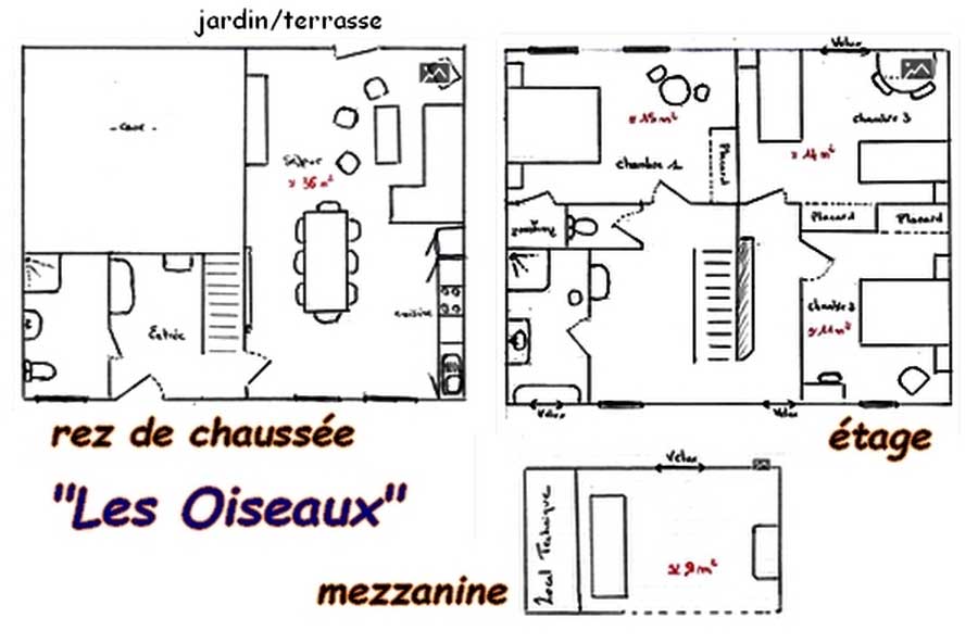 Dans "Les Oiseaux" : 2 salles d'eau dont une avec WC, 1 WC indépendant, 3 chambres (1 lit en 160 avec possibilité d'un lit d'appoint en 90, 1 lit en 140, 2 lits en 90 et un canapé convertible clic-clac en 140), espace mezzanine indépendant (convertible BZ en 140).