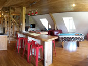 1er étage : 1 grande salle de jeux (40m²) avec billard, baby-foot, canapés, coin TV et cheminée, bar et coin cuisine, 2 chambres (11m²) avec lits 160.