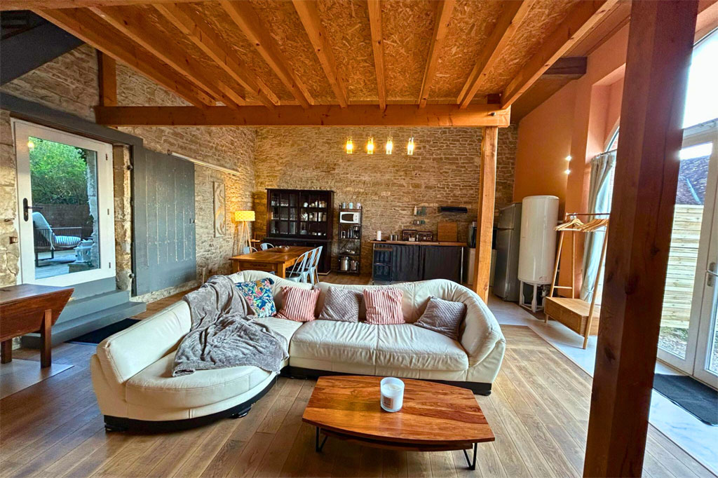 La Grange: Grand espace de 60 m² pour repas ou petites réceptions jusqu'à 30 personnes en intérieur, cuisine sur 55 m². 3 chambres, 1 salle de bain et 1 spa pour 4 personnes.