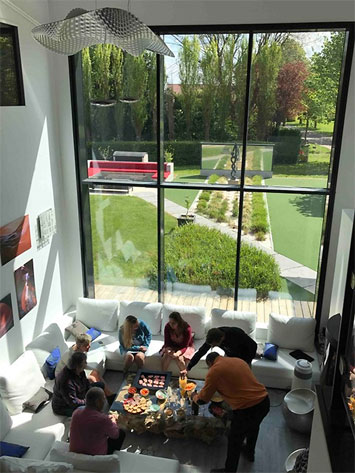 un salon toute hauteur mitoyen avec la pièce du spa,