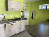 Maison avec corps de ferme de 5 chambres, 2 salles d'eau, 2 WC, pièce à vivre d'environ 50 m² avec coin cuisine équipée, table en ilot 5 places et séjour avec table 12 personnes, coin salon avec canapé convertible et fauteuils.
