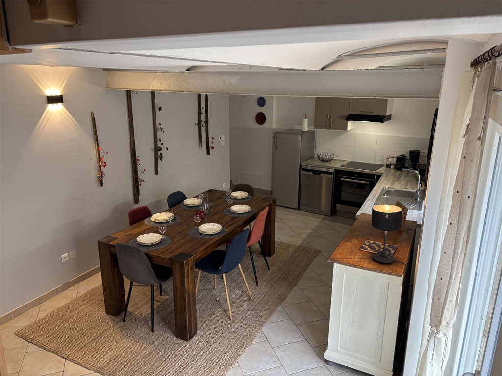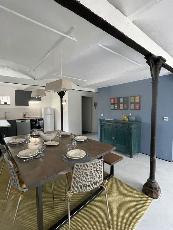 - Avec espace de vie (coin repas avec très grande table 15 convives, banc et chaises) et une cuisine entièrement équipée + buanderie