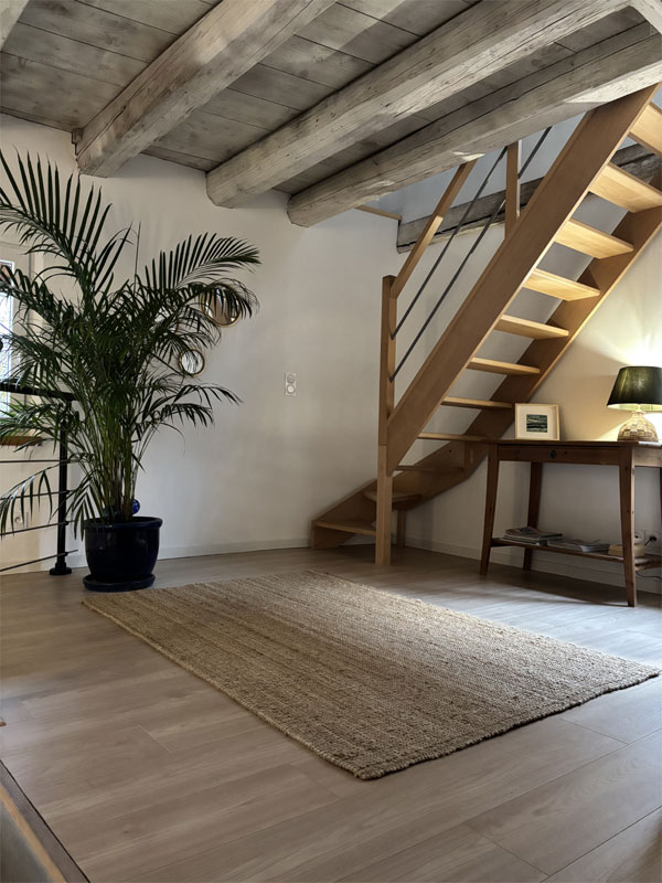 Située à la campagne, dans un écrin de calme, cette grange rénovée avec soin par mon époux et moi raconte une histoire où les traces du passé se marient à merveille avec une décoration contemporaine. Voutains, poutres d'origine simplement blanchies à la chaux et colonnes dialoguent avec des lignes épurées et une ambiance lumineuse pensée pour le confort d'aujourd'hui.
