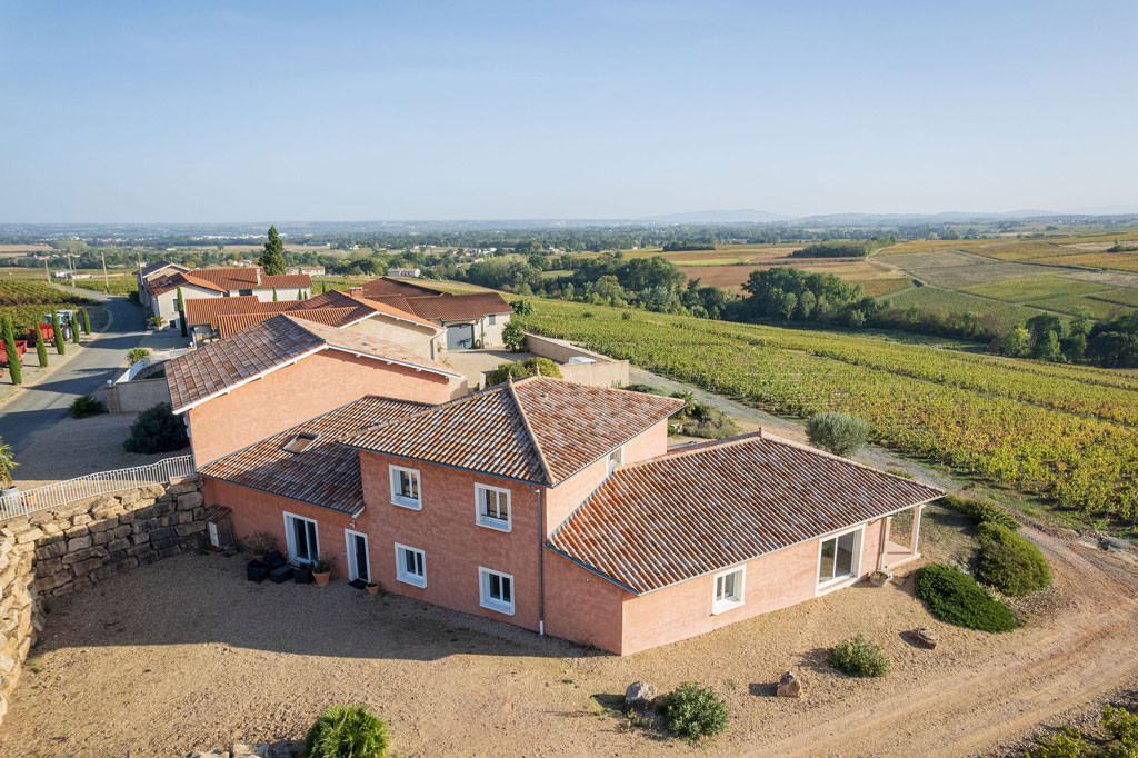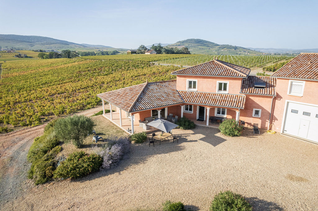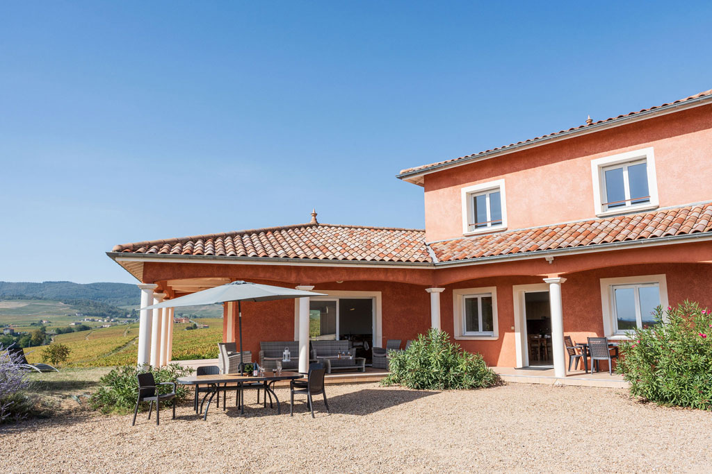 Maison neuve de style provençale située en plein coeur du Beaujolais avec vue panoramique sur le vignoble, au pied de la colline du Mont Brouilly. Ce corps de bâtiment abrite nos 3 gîtes indépendants dans un cadre calme et confortable avec pelouses, palmiers et oliviers. Notre salle de réception vous permettra de prendre vos repas ensemble ou d'organiser la manifestation pouvant réunir jusqu'à 70 personnes selon la disposition souhaitée avec cuisine aménagée pour traiteur.