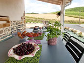 Grande pièce à vivre au RDC donnant sur une terrasse couverte avec vue imprenable sur le vignoble et la campagne, spa en extérieur touchant la terrasse.