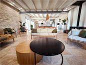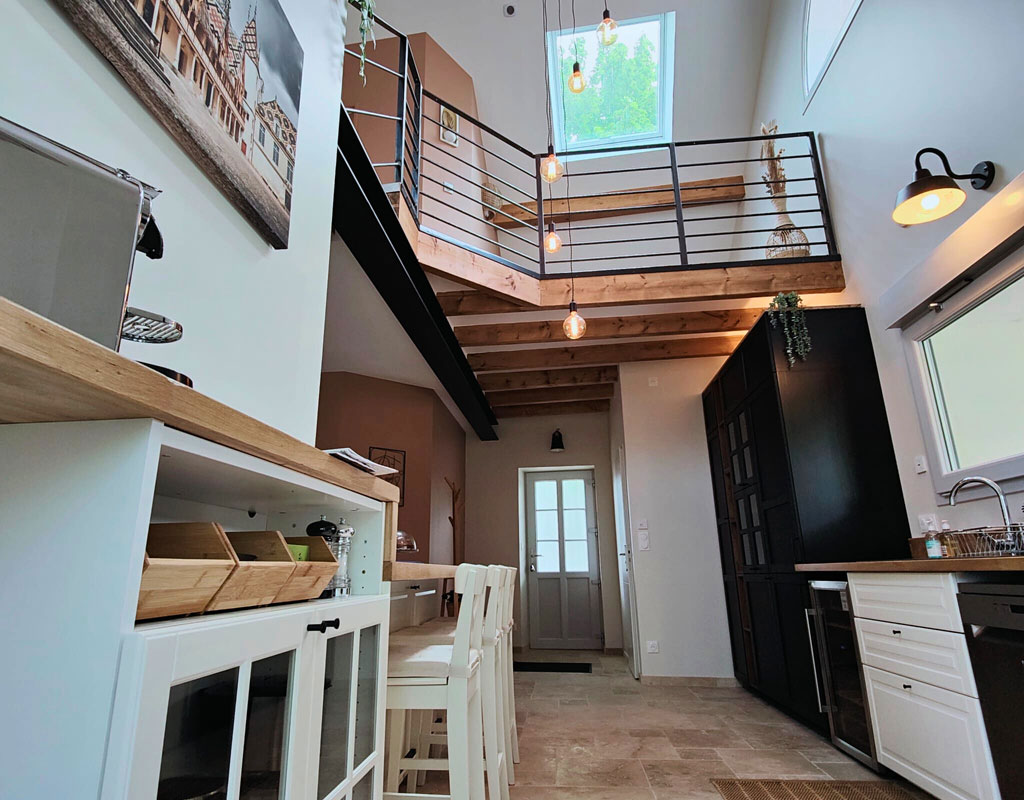 Grange réaménagée où poutres et pierres ont été conservées au maximum.