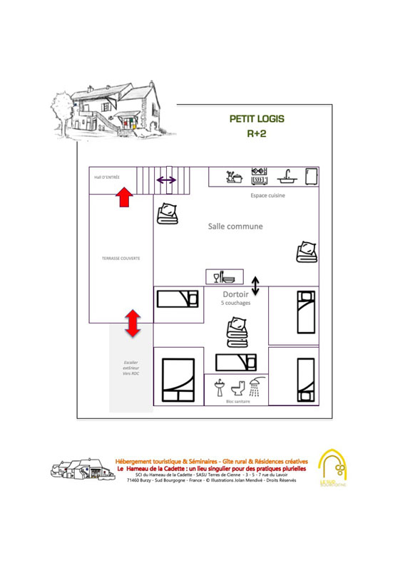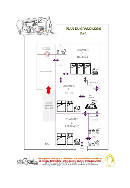 Nous avons rénové avec soin cette ancienne ferme du clunisois pour y aménager votre hébergement. Il comprend 2 logements indépendants. L’un peut accueillir au moins 9 personnes (jusqu'à 12 couchages). L’autre est aménagé dans les combles pour 4 à 5 personnes. Ils se combinent aisément en une habitation pour 15 personnes maximum. Les espaces extérieurs sont aménagés dans un environnement naturel et verdoyant.