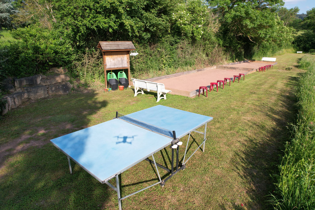 En extérieur, piscine 14m x 4m avec plages et mobilier, 2 terrains de pétanque, mini terrain de foot avec cages, espaces repas.