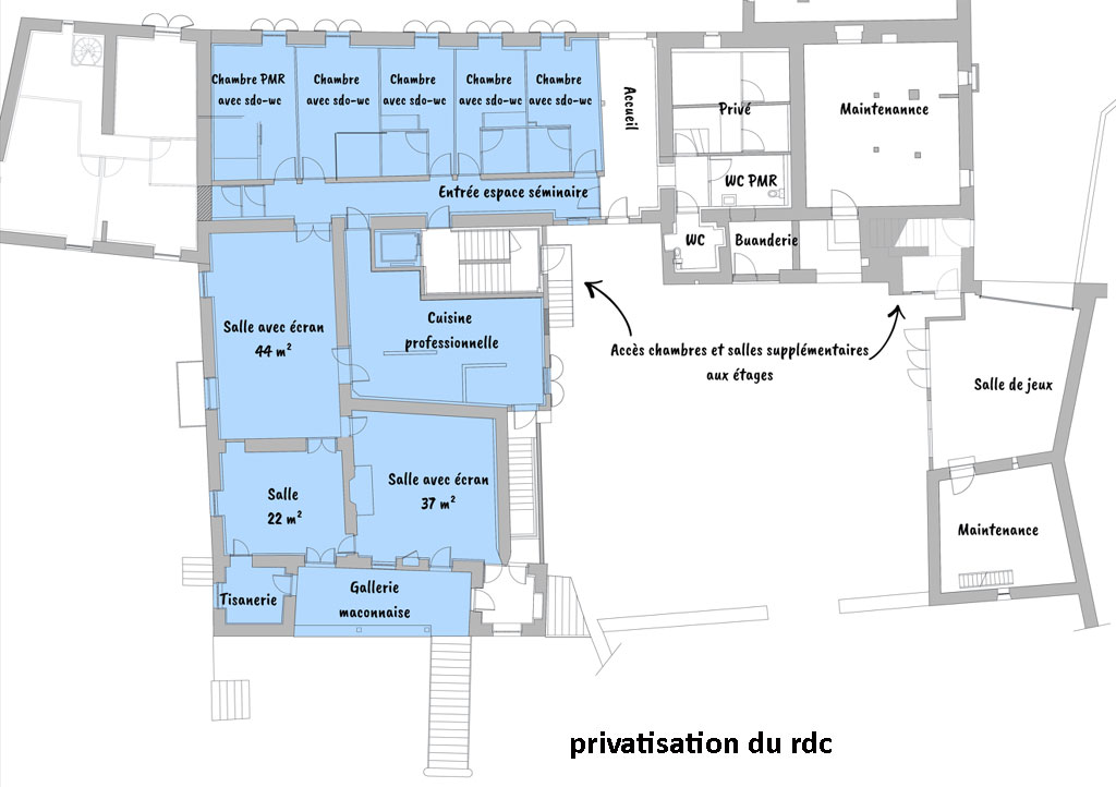Le gîte du rez-de-chaussée comprend au total 3 pièces de 37m², 22m² et 40m² en continuité d'une cuisine professionnelle parfaitement équipée. Tout le groupe peut donc partager les repas dans ces 3 pièces ou séparément selon les souhaits, ainsi qu'à l'extérieur.