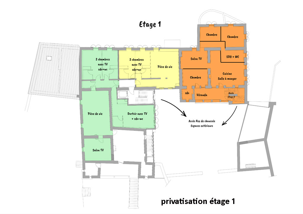 Le premier bâtiment peut accueillir jusqu'à 36 personnes répartis en 10 chambres, 10 salles de bain avec toilettes (dont 1 chambre + sdb PMR), 2 toilettes supplémentaires dont 1 PMR.