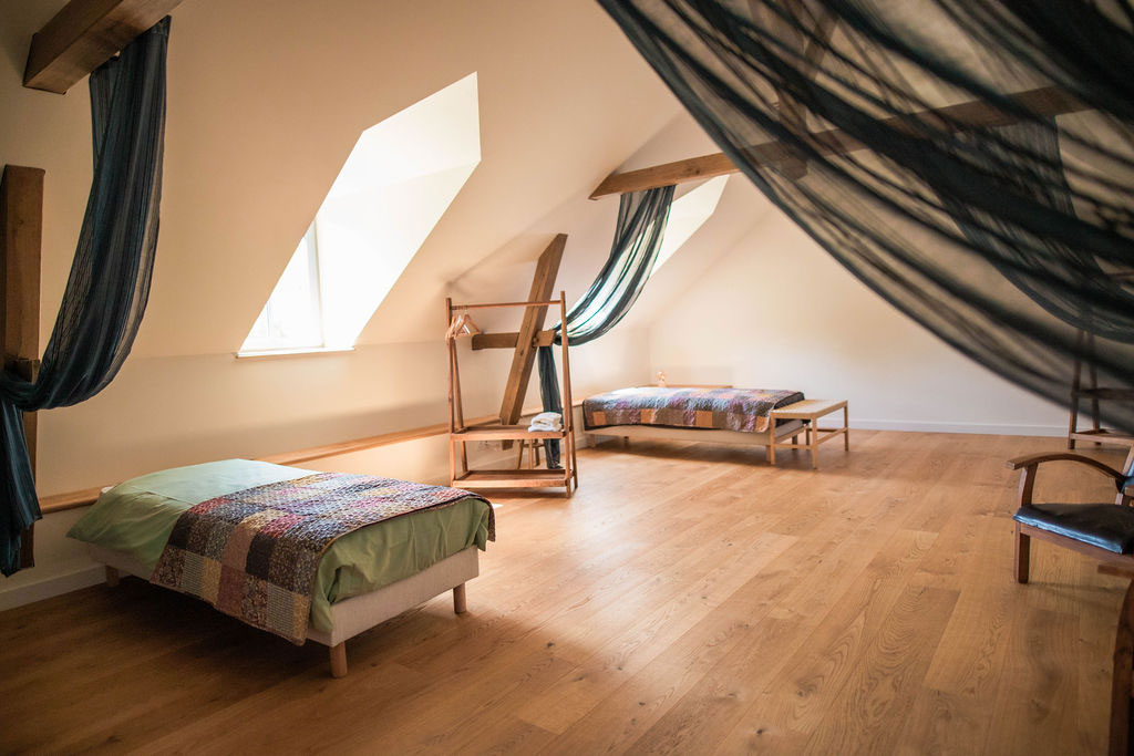 Le gîte principal peut accueillir jusqu’à 15 personnes dans une grande bâtisse ancienne rénovée. Il comprend 6 chambres très confortables, toutes équipées de leur salle de bain privative, offrant à la fois convivialité et intimité pour les groupes.