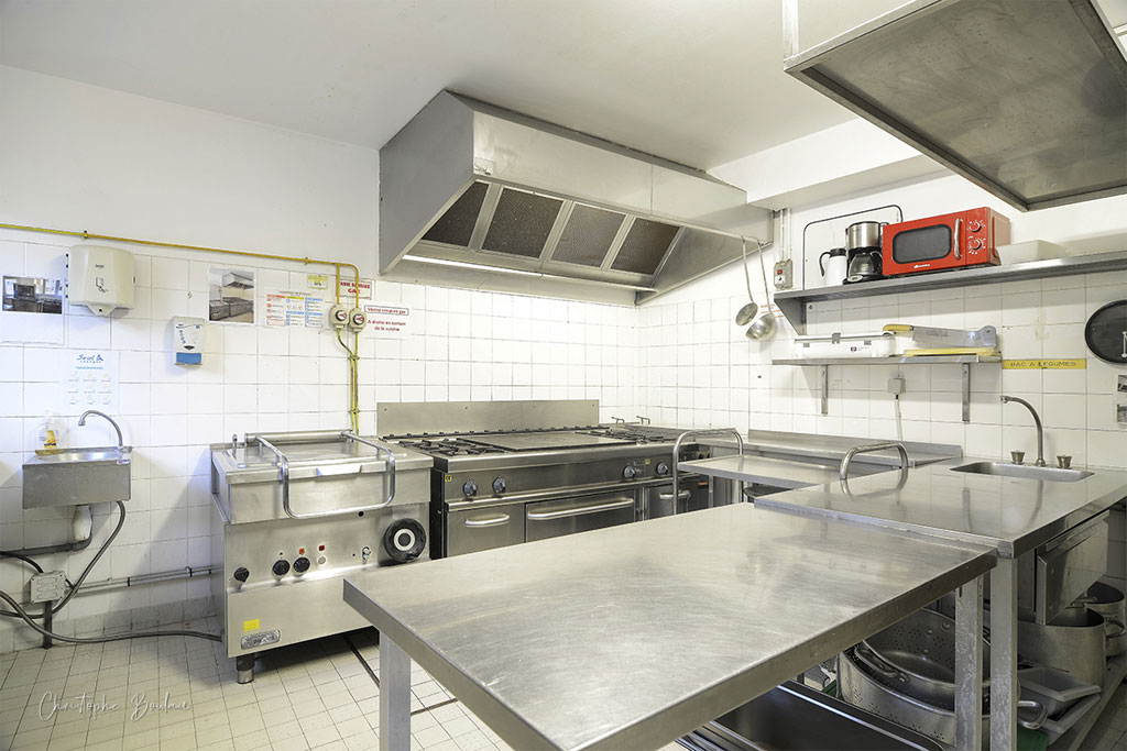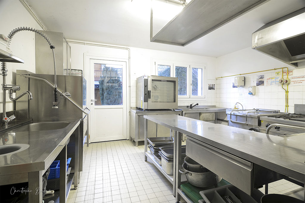 Cuisine équipée avec du matériel professionnel : Réfrigérateur - Congélateur - Plaques de cuisson - Four - Micro-ondes - Vaisselle - Lave-vaisselle