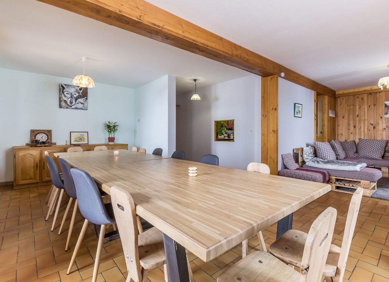 "Les Aiguilles" : séjour de 40 m² avec cuisine ouverte sur la salle à manger avec une table pouvant accueillir 15 personnes, ainsi qu'un salon avec 2 canapés 3 places, 2 fauteuils, 3 poufs et une télé.