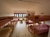 Grand dortoir de 14 lits (4 lits superposés, 6 lits simples) , 1 chambre 2 lits simples, 1 chambre 2 lits superposés, 2 chambres avec 2 lits simples+1 lit superposé, 3 WC et 4 douches, lavabos. Local à skis.