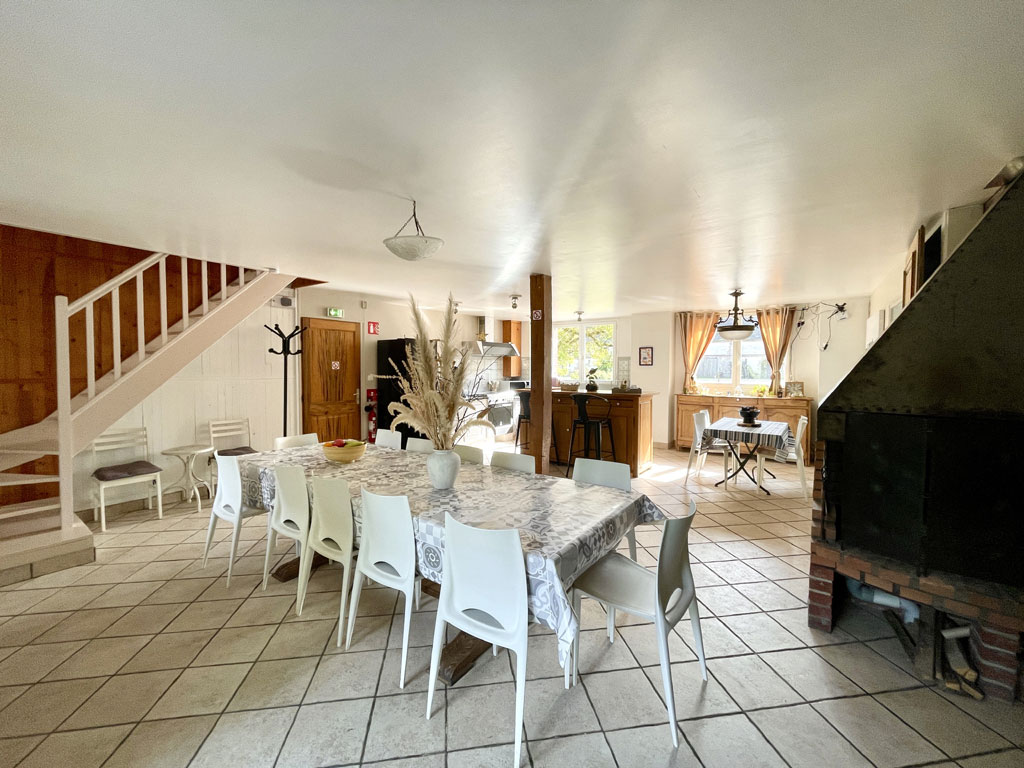 180 m² - 1 gîte de 4 chambres, 5 salles d'eau, 6 WC, 1 salle de 70 m² dans le grand gîte avec cheminée centrale, cuisine américaine semi-pro, une terrasse de 100 m² et un jardin de 3000m² non clôt, vue sur le parc.