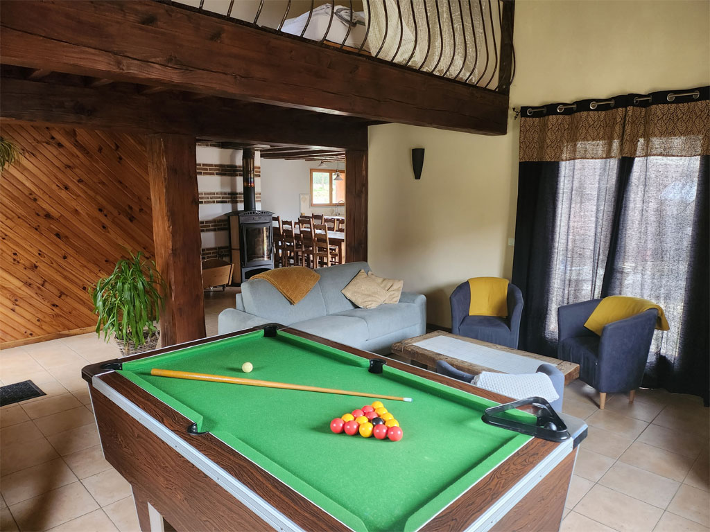une pièce à vivre avec billard, baby-foot, TV