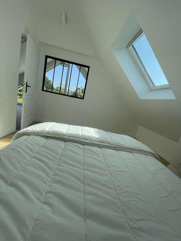 La maison contient 4 chambres séparés (dont une en RDC), un pallier cathédrale pour les personnes voulant dormir dans les étoiles avec un vue imprenable. 2 salles de bain et 2 wc séparés sont répartis en rdc et à l'étage. Les chambres sont toutes équipées de lits de qualité supérieure avec un format 80x200 ou 160x200. Dans la buanderie vous aurez à votre disposition un lave linge.