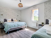À l'étage, vous découvrirez quatre autres chambres, chacune avec sa propre salle d'eau et ses toilettes privatives. Trois de ces chambres sont équipées d'un lit double et d'un lit simple, tandis que la quatrième chambre dispose de quatre lits simples, pouvant être arrangés pour former un lit double. De plus, un coin détente invitant et un espace fitness sont également disponibles pour votre confort.