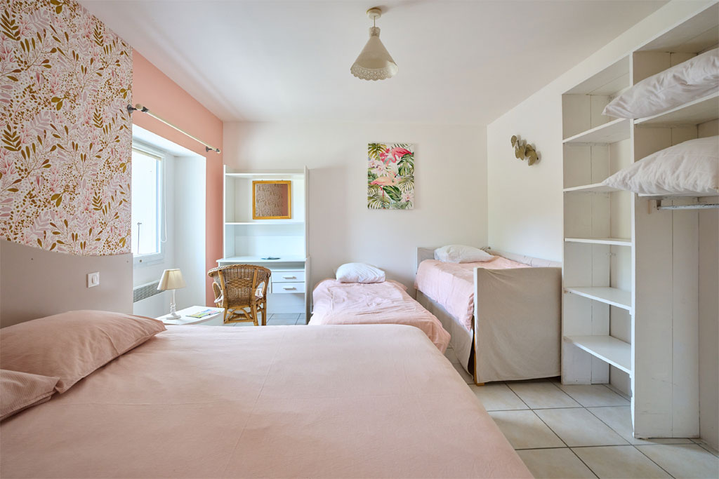 1 séjour/salon, 1 cuisine (entièrement équipée), 3 chambres, 2 salles d'eau, 2 WC (dont 1 indépendant), 1 terrasse couverte et jardin clos et terrain de pétanque.