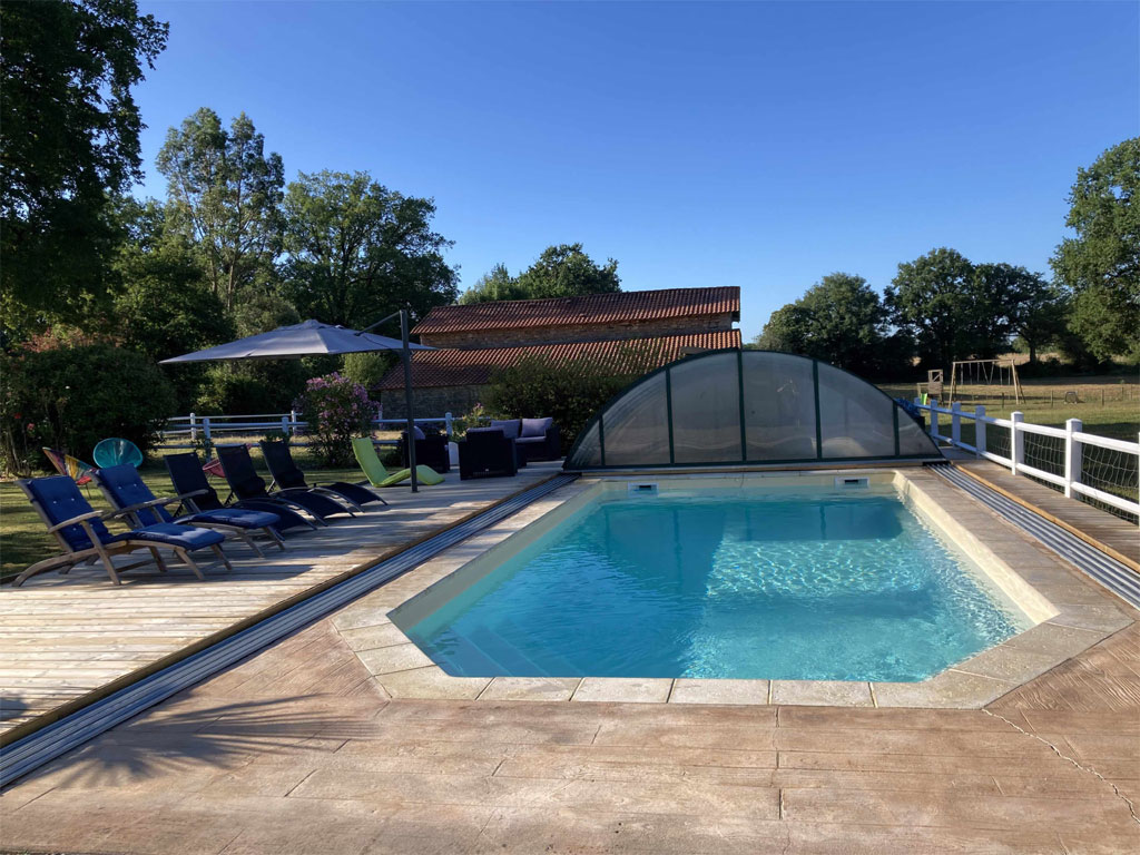 Accès à la piscine du propriétaire aux beaux jours de 10h à 19h : prêt de bouées et de jeux d'eau