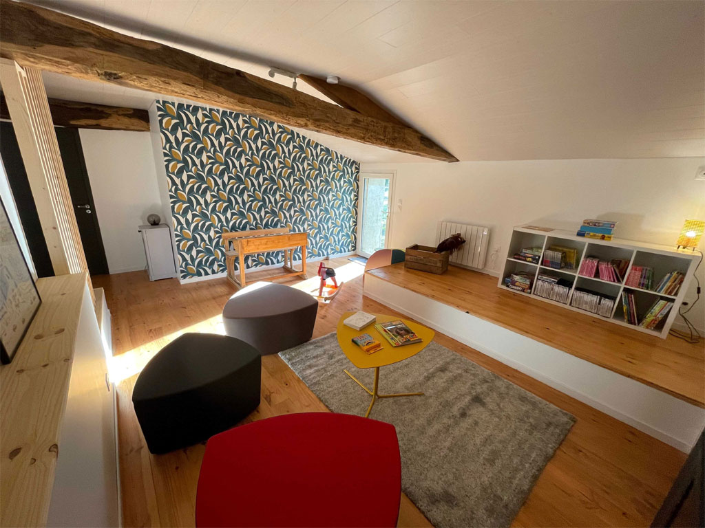 - Une mezzanine de 18 m² très lumineuse, qui fait office de 5ème chambre si les lits sont dépliés, desservie par un palier de 8 m², comprenant 2 lits simples gigognes (80X200)