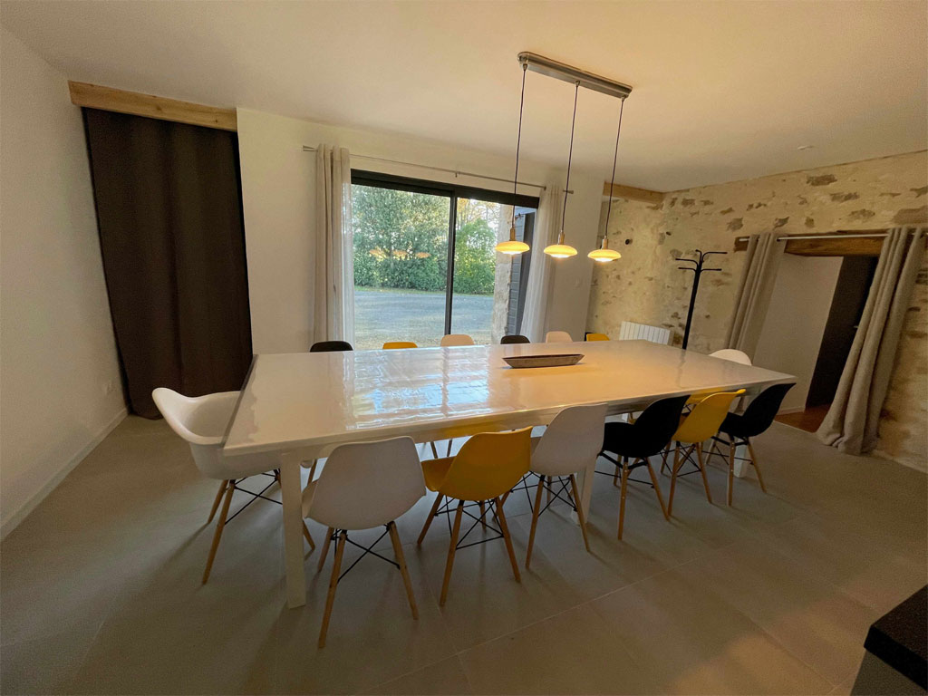 - Une salle à manger 14 pl avec une baie vitrée donnant sur l’entrée du gîte