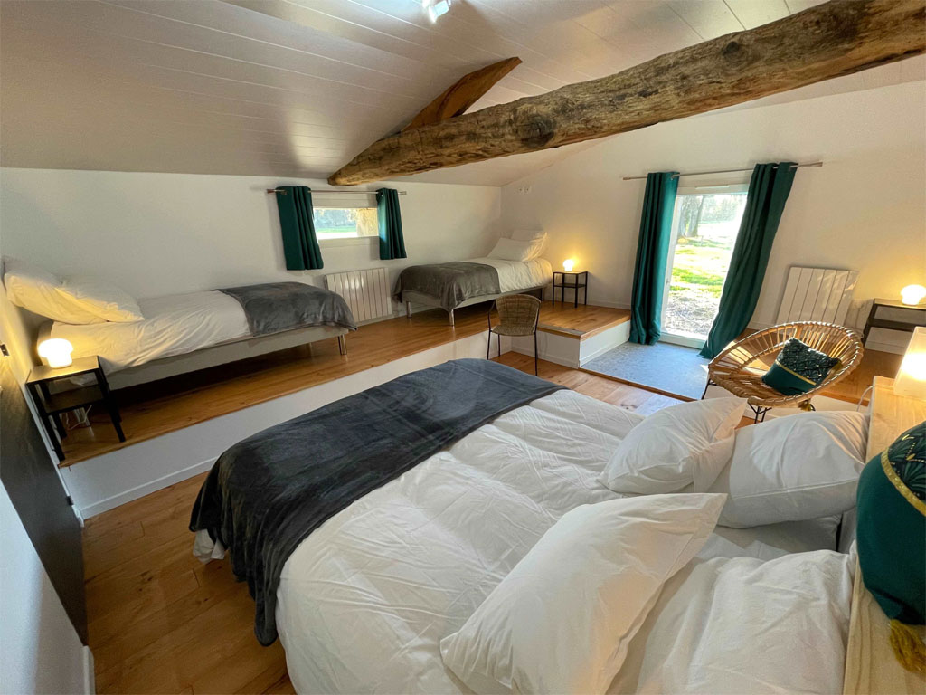 - Une 1ère chambre parentale de 5 couchages et 28 m² (1 lit double de 160 + 3 lits de 90)