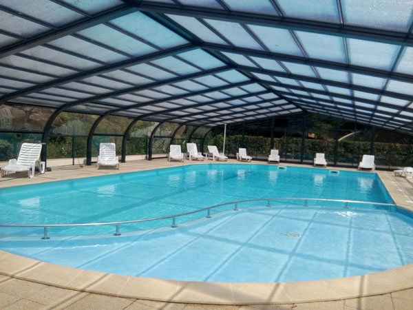Terrasse - Salon de jardin - Jeux d'enfants - Piscine couverte et chauffée en commun avec le camping (du 15/05 au 15/09) à 5mn à pied