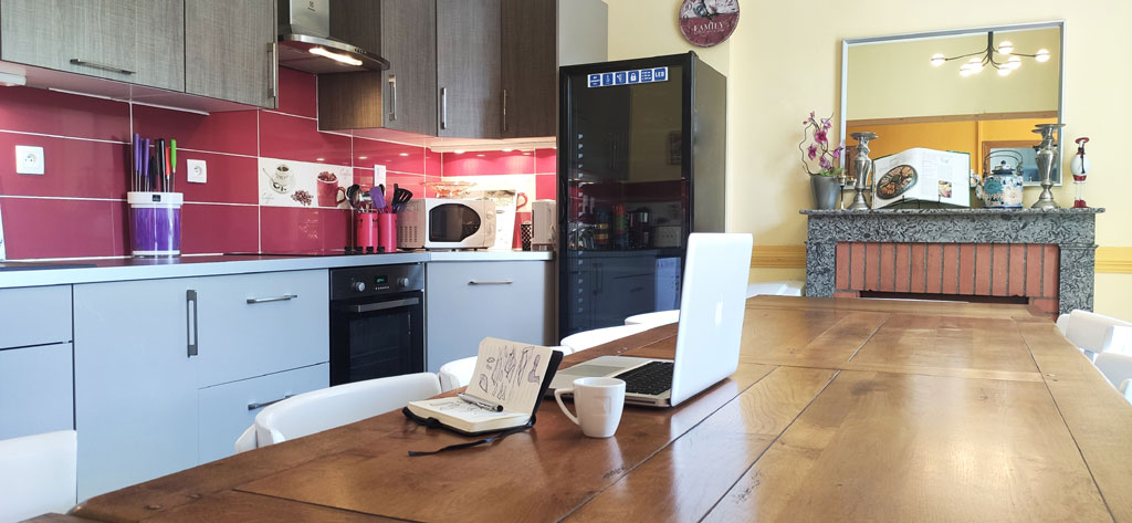 Le rez-de-chaussée reçoit un salon, une bibliothèque et une grande cuisine où toute le monde pourra se réunir autour d’une bonne table. Le couloir dessert également deux chambres avec des salles d’eau.