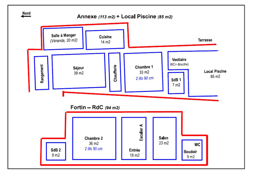 Enfin, l'aile annexe abrite un local de 85 m², avec terrasse, pour la piscine couverte et chauffée.