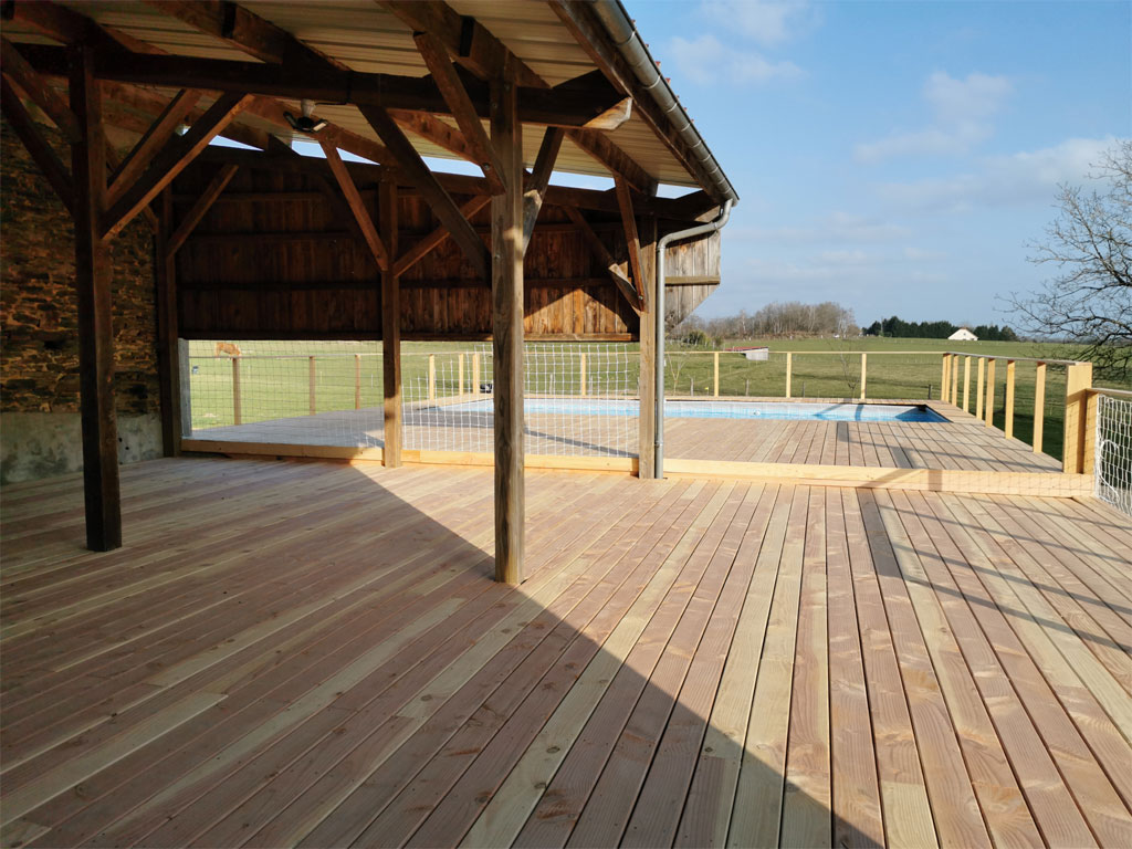 Voua aurez un accès direct à la piscine (9.5x4.5) sécurisée et protégée par une clôture et entièrement réservée aux locataires et une grande terrasse ombragée de 70 m², équipée avec un barbecue, le tout sur un terrain arboré avec des châtaigniers, entièrement clôturé et fermé de 15000m².